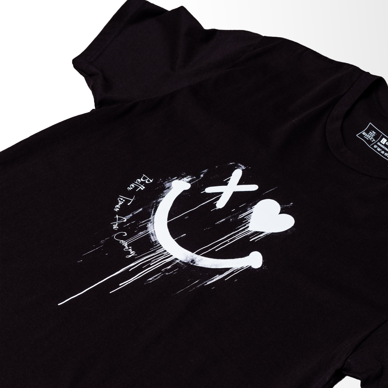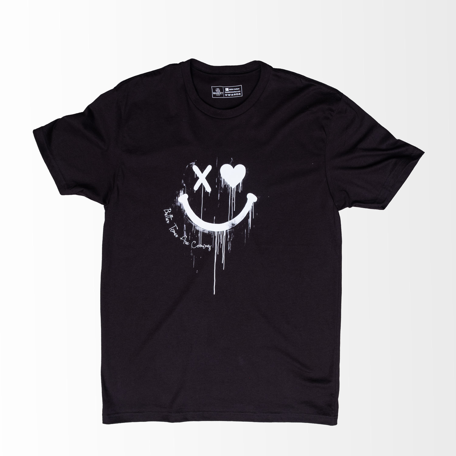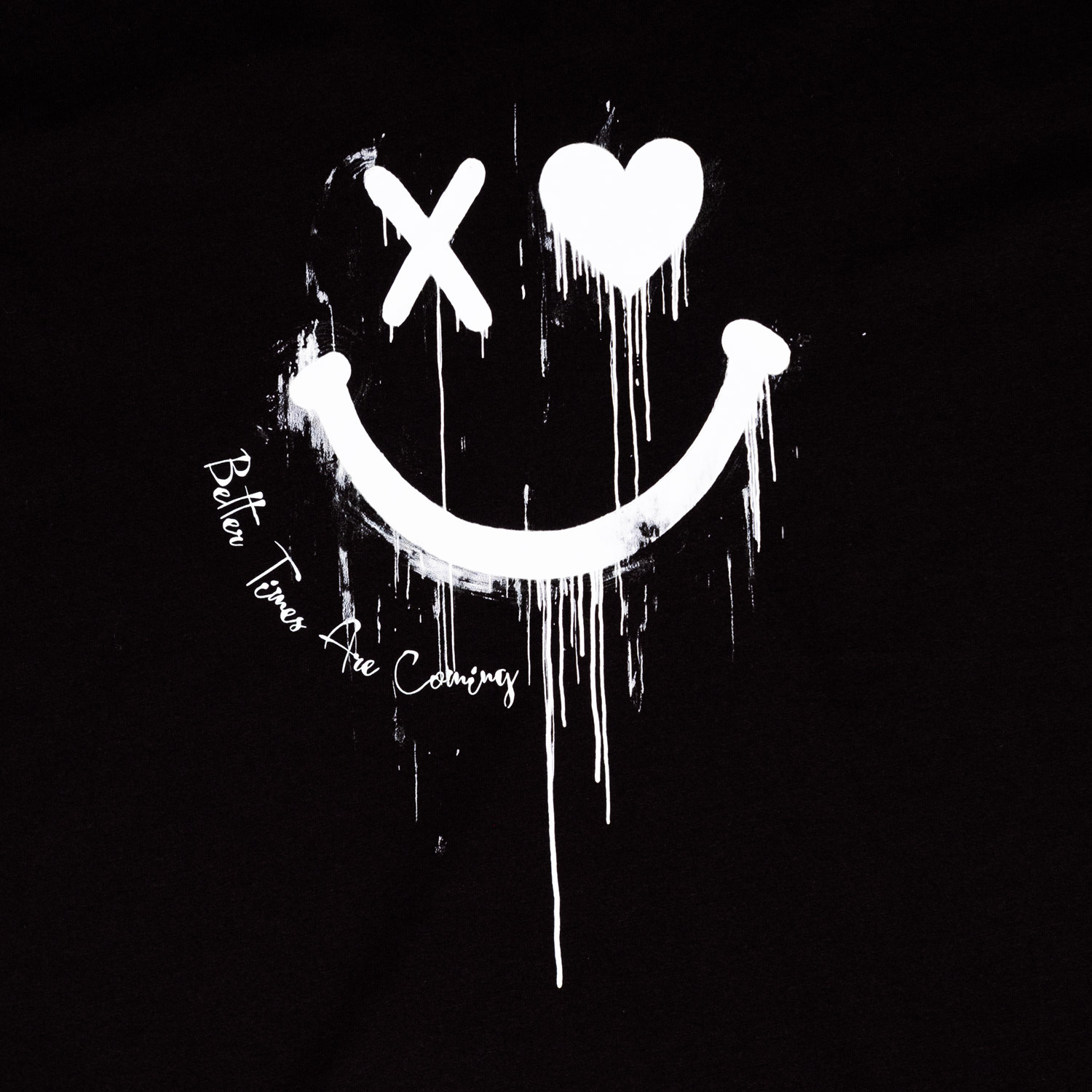 The Better Is Coming tee blends street art with raw expression. A bold white smiley with an X and heart eye, dripping paint, and a powerful message of hope. Perfect for anyone who wears positivity with an edge.