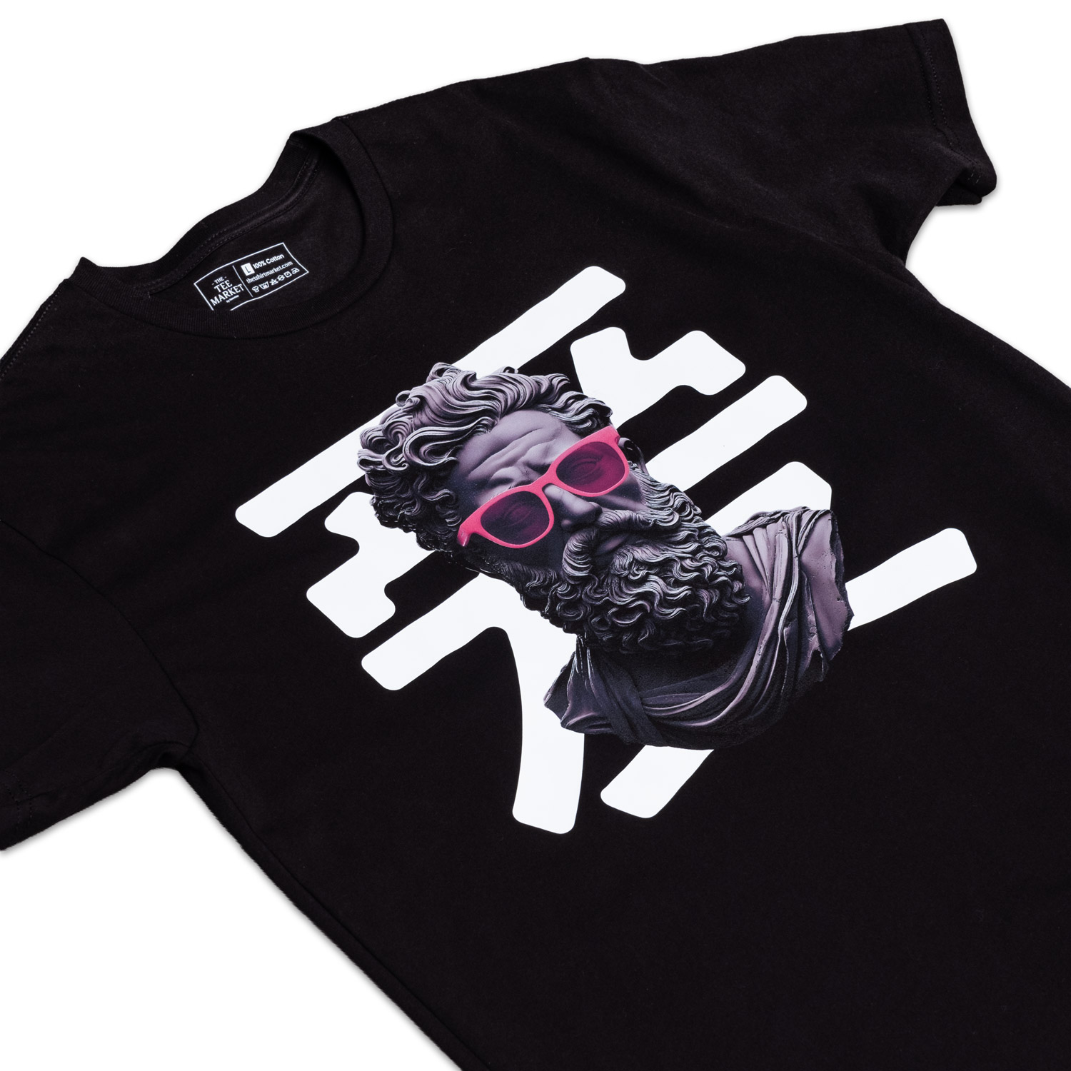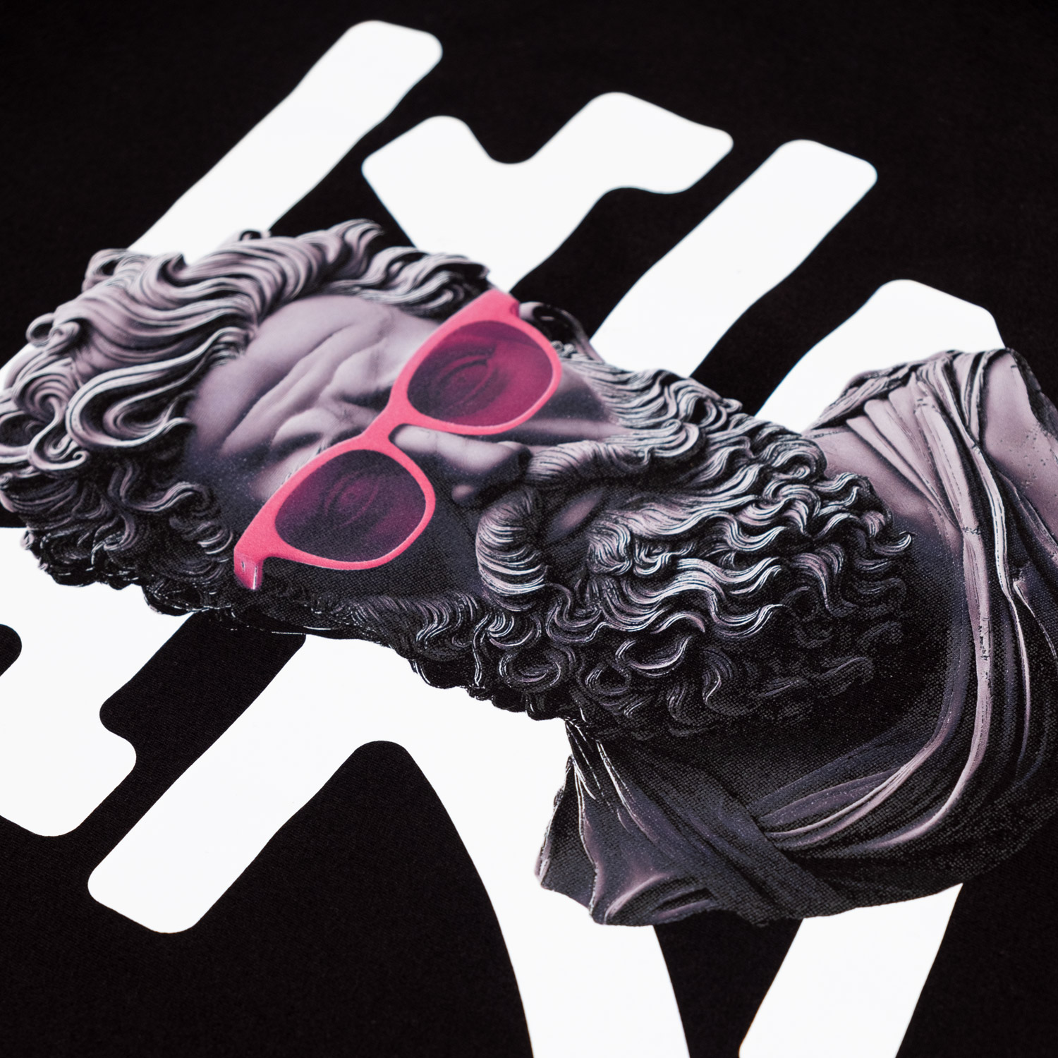 A fusion of classical art and modern street style, featuring a Greek statue rocking bold pink shades. History has never looked this cool.