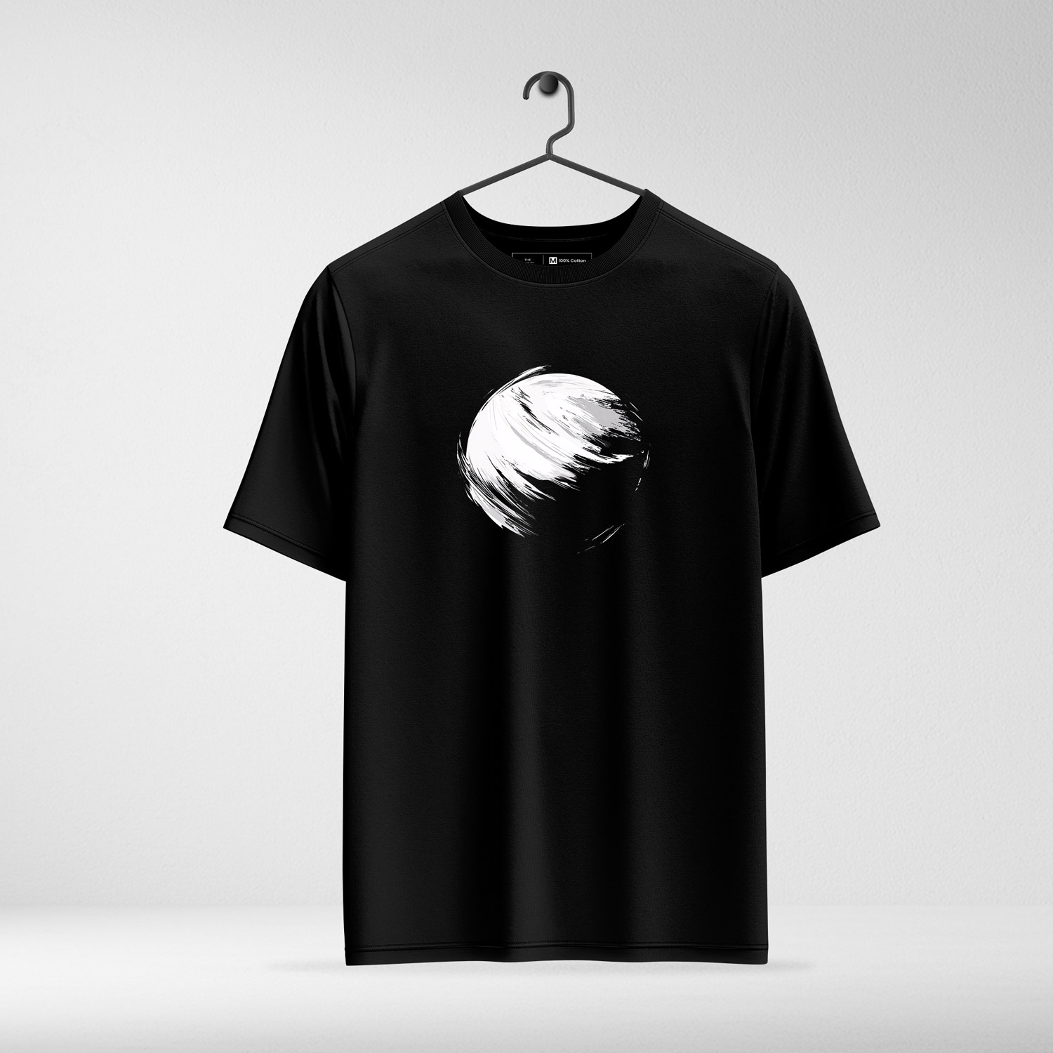 Minimalist and mysterious, this black tee features an abstract white brushstroke sphere, capturing the allure of simplicity and shadow.